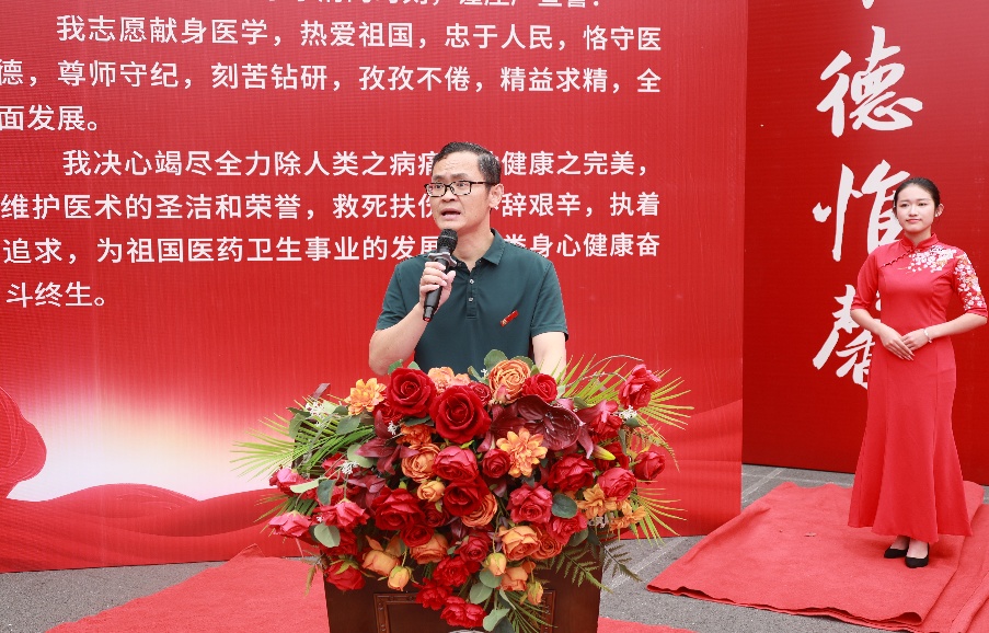 医学院党委书记向志钢宣读了2025级新生辅导员与班主任的聘任决定,与会领导为受聘教师颁发了证书,并为各班级代表授旗。随后,副院长李中正带领全体新生庄严宣誓:“我志愿献身医学,热爱祖国,恪守医德……”誓言铿锵,展现了新一代医学生的责任与担当。